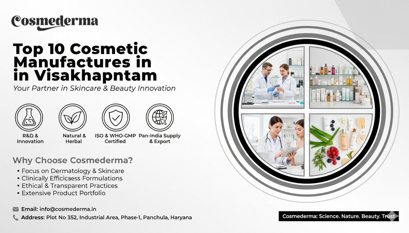 Top 10 Cosmetic Manufacturers in Visakhapatnam – Andhra Pradesh is one of the most rapidly growing and developing states in India. The government policies and the awareness of the people about their skin and cosmetic care have increased the demand for high-quality cosmetic products, especially in cities like Visakhapatnam. Visakhapatnam has emerged as a personal care and derma product manufacturing local hub. The city’s coastal logistics, rising domestic demand, and a cluster of contract manufacturers, private-label houses, and PCD/derma suppliers create a brand-friendly atmosphere for those who want quick local supply, lower transit times to south-India markets, and easy access to ports for export.